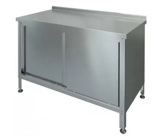 Габариты 900х600х865 мм, вес нетто 38 кг, вес брутто 55,2 кг.Материал нержавеющая сталь, двери купэ, с бортом.