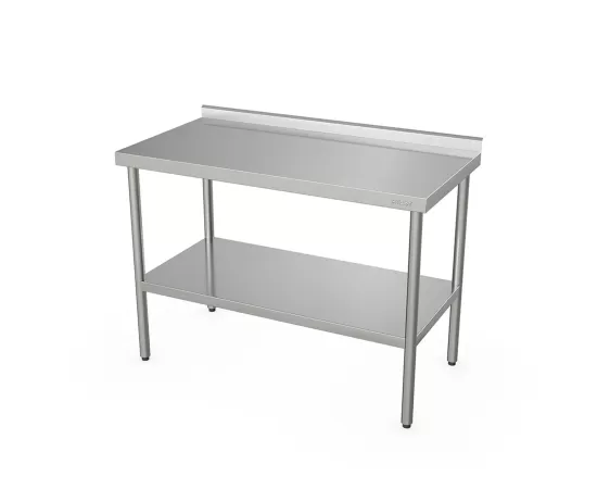 1200х600х870 мм, столешница и сплошная полка - AISI430, каркас - круг.труба AISI201, 1 борт 50мм, углы столешницы заварены
