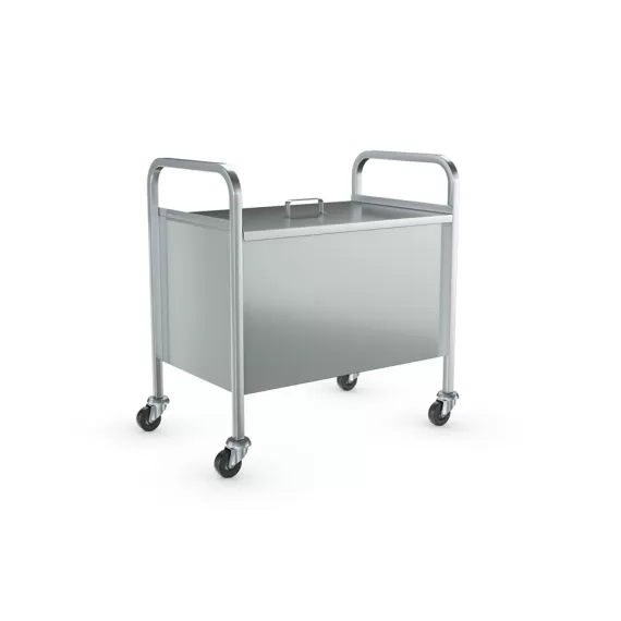 Тележка для муки ТМ-Л-100-02 (ТМ-100), 800х500х840 мм, AISI304, размеры бункера 725х450х450мм, с крышкой, 1 колесо с тормозом, сварнаяТележка для муки ТМ-Л-100-02 (ТМ-100) предназначена для накопления просеянной в Мукопросеивателе «Каскад» муки и транспортировки ее к месту использования. Тележка имеет сварную конструкцию. Рамы тележки изготовлены из нержавеющей трубы AISI 304 сечением 25х25 мм. К рамам приварен герметичный бункер из нержавеющей стали AISI 304 объемом 140 литров. Сверху бункер накрыт нержавеющей крышкой. Грузоподъемность тележки составляет 100 кг. Тележка снабжена четырьмя колесами диаметром 75 мм, одно из которых оснащено тормозом.