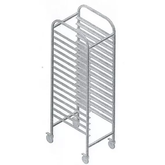 Габариты: 650х410х1800 мм, сварная, загрузка по широкой стороне, размер противней 600х400 мм, кол-во уровней 15, расстояние между уровнями 100 мм, 4 колеса, 2 из которых с тормозами, материал - нержавеющая сталь.