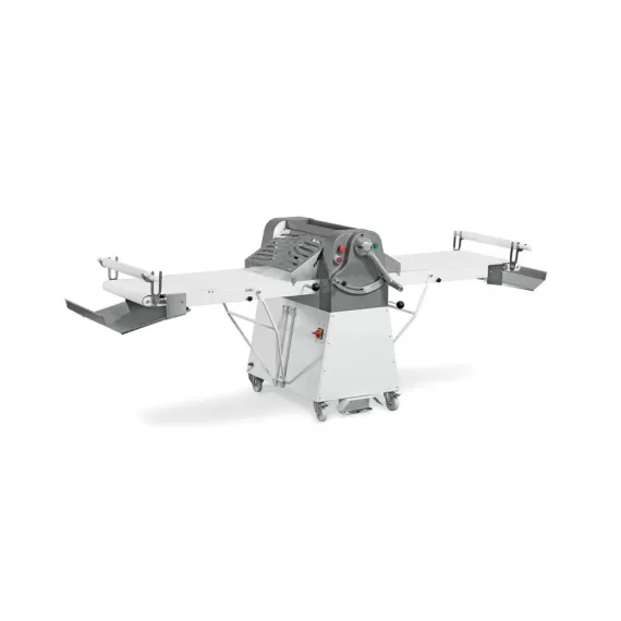 Габариты: 3690x1060x1170 мм, напряжение 380В, мощность 750Вт, установка напольная, вариатор скорости, ширина рабочей поверхности 600 мм, ширина раскатки 600 мм, длина крыла 1400 мм, диаметр валков 80 мм, максимальный зазор между валками 50 мм, скорость вводной конвейерной ленты 6, 18,9 м/мин, скорость выводной конвейерной ленты 9,4, 29,5 м/мин. Лоток для муки. Реверс валков с помощью ножной педали и джойстика управления. Корпус выполнен из окрашенной стали, валки – из хромированной стали, защитные решётки – из нержавеющей стали, верхняя крышка – из пластика.