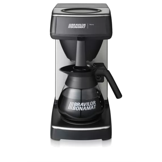 Кофеварка т.м.Bravilor Bonamat мод. Novo, 214x391x424 мм, 220В, 2130Вт. Ёмкость: 1 кувшин (12 чашек). Время приготовления: 5 мин/1 кувшин. Производительность: 18 л (144 чашки). Подключение к водопроводу: нет. В комплект входит стеклянный кувшин и фильтрующая ёмкость из пластика. 1 кофеварочный аппарат, 1 кувшин и 2 горячие поверхности.