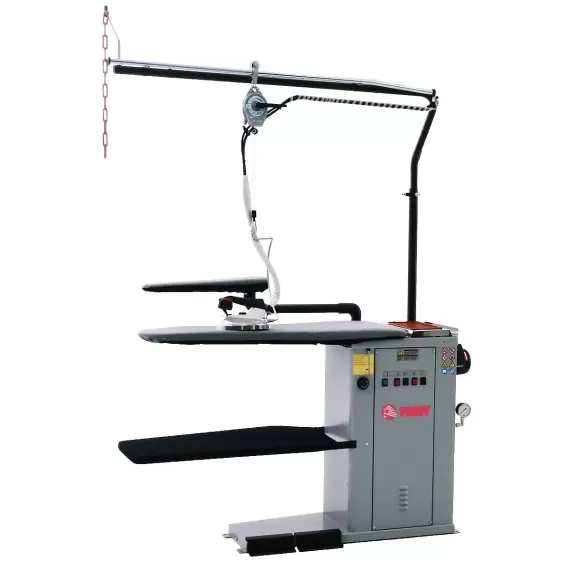 Cтол гладильный серии FVC. Универсальный гладильный стол c нагреваемой поверхностью и вакуумным прижимом. Размер гладильной поверхности 1100x380x230 мм. Размеры с подвесом 1960x650мм. Дополнительный рукав для глажения стандартной формы с нагревом. Освещение, рельсы и подвес для утюга. Утюг электропаровой F-65 с тефлоновой подошвой. Мощность вакуумного вентилятора - 0,25 кВт, мощность нагрева доски - 1 кВт, мощность утюга 0,8 кВт, мощность тэнов бойлера 3,3 кВт. Встроенный парогенератор 5л/3,3 кВт/давление 2,5 Бар. Общая мощность - 5,35 кВт, 380В/3ф, 1550x580x1100мм