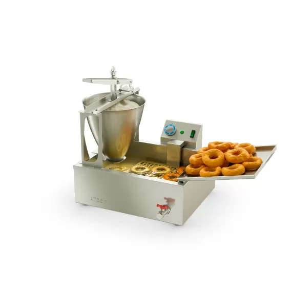 770х505х550 мм, 3.9 кВт, 220 В, +50...+190°С, 200 пончиков/час, объем заливаемого масла - 8л, объем фритюрной ванны -16л, объем дозатора для теста - 6л