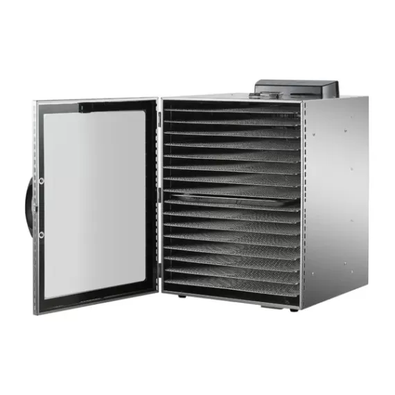 Габаритные размеры: 570x470x690 мм, эл. мощность 1500Вт, напряжение 220В, температурный режим 30-90С, 16 решеток 380х280 мм, таймер 12 часов, корпус и решетки нерж.сталь.