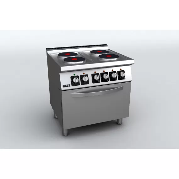 Габаритные размеры: 800x730x850мм, габариты в упаковке 840х822х1255мм, напряжение 380В, эл. мощность 16400Вт, 4 круглых конфорки Ø223мм, духовой шкаф GN 2/1