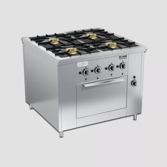 Габариты:1000х990х850 мм, 41000 Вт. Плита с 4-мя латунными двухрядными горелками, каждая имеет массивную чугунную решетку размером 430х430 мм. Съёмная подконфорочная емкость. В нижней части плиты-жарочный шкаф с диапазоном температур 110-325°С. Газконтроль, запальные горелки, пьезоподжиг каждой горелки, работа на природном или сжиженном газе. Ножки плиты регулируются по высоте.