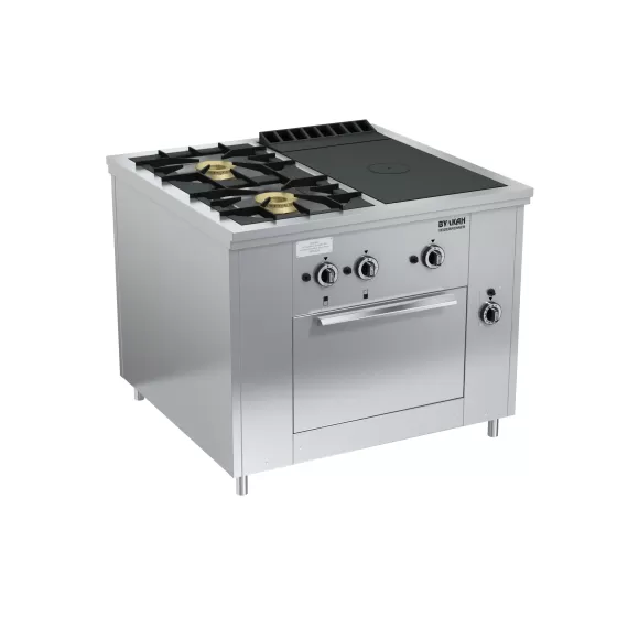Габариты: 1000х990х850 мм, 34800 ВтПлита из нержавеющей стали с 2-мя двухрядными горелками и варочной чугунной поверхностью. Открытые горелки имеют массивные чугунные решетки размером 430х430 мм, что позволяет размещать на них гастроемкости объемом до 50 л, съёмная подконфорочная емкость. Под чугунным настилом располагается мощная горелка, быстро и равномерно нагревающая всю поверхность рабочей зоны, благодаря чему на нем можно разместить как крупные гастроемкости, так и множество мелких. В нижней части плиты-жарочный шкаф с диапазоном температур 110-325°С. Газконтроль, запальные горелки, пьезоподжиг каждой горелки, работа на природном или сжиженном газе. Ножки плиты регулируются по высоте.