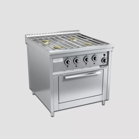 Габариты: 800х900х850 мм. Мощность: 32 кВт. Подключение: газ. Расход газа: прир (сжиж)-3,27(2,54)м3⁄ч (кг/ч). Плита из нержавеющей стали с 4-мя горелками по 6 кВт, съёмной решеткой из нержавеющей стали, газовым духовым шкафом GN2/1, газконтроль, работа на природном или сжиженном газе, герметичная столешница, ножки плиты регулируются по высоте.