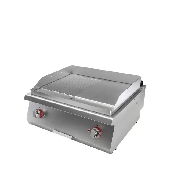 Габариты 800*730*280, вес 76 кг, сечение кабеля 5x4 мм. Поверхность жарочная изготовлена из нержавеющей стали, толщина покрытия 15/10 мм. Комбинированное жарочное покрытие ½ гладкое и ½ рифлёное изготовлено из конструкционной стали, съёмное. Контроль температуры осуществляется при помощи термостата. По бокам и сзади расположены бортики, для предотвращения загрязнения. В комплекте с лотком для сбора жира, которое легко вынимается для очистки. Мощность 9 кВт, габариты в упаковке 820*800*530, вес брутто 86 кг, 380 В