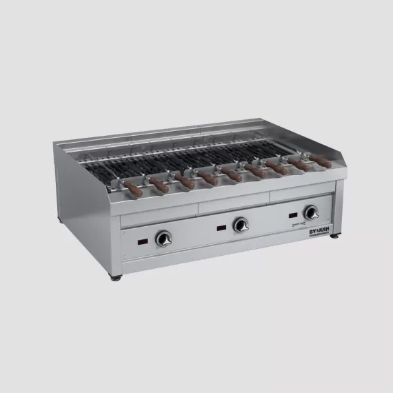 Габариты: 1000х700х325 мм, 16200Вт, 380ВНастольная электрическая шашлычница из нержавеющей стали с 3-мя зонами нагрева. Особенность этой шашлычницы – наличие лавовых камней, долго держащих тепло и выполняющих роль раскаленных углей. Капли жира, попадая на камни, образуют лёгкий дымок, придающий мясу неповторимый вкус. Добавив на камни немного древесной стружки, вы получите продукт с тонким ароматом копчения. Шампура из нержавеющей стали имеют удобную деревянную ручку и специальную геометрию для фиксации их в разных положениях.