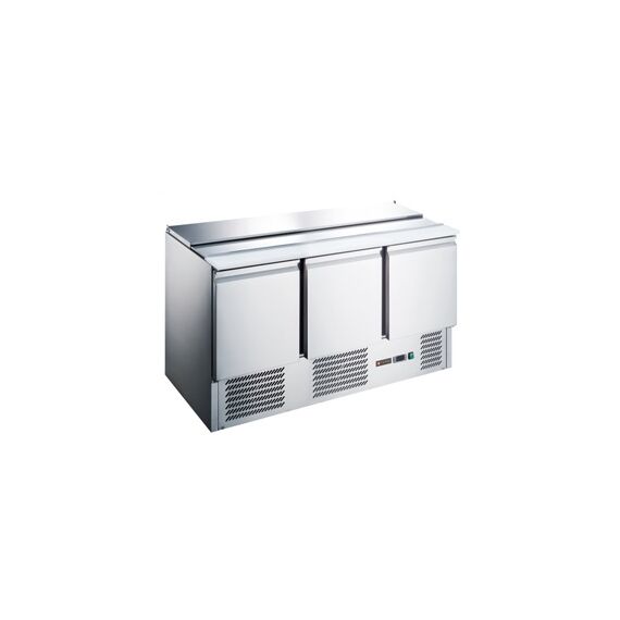 1365x700x876 мм, 230В, 0,24 кВт, 368 л, +2...+8 C, 3 двери, полки GN1/1, одна полка для каждой двери в комплекте, отделение под гастроемкости с крышкой: 4xGN1/1 (гастроемкости в комплект не входят), столешница для нарезки из нейлона, нижнее расположение холодильного агрегата, вентилируемое охлаждение