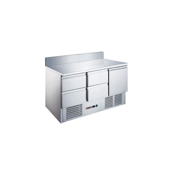 1365x700x976 мм, 230В, 0,24 кВт, 368 л, +2…+8 С, 1 дверь, 2 + 2 ящика, полка GN1/1, одна полка в комплекте, столешница из нержавеющей стали, с бортом, нижнее расположение холодильного агрегата, вентилируемое охлаждение