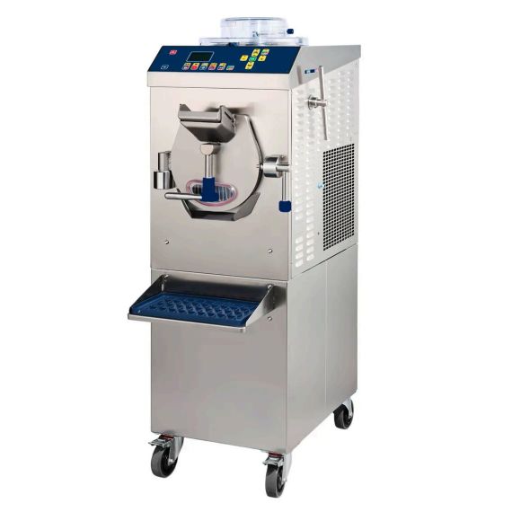 485x798x1343 мм, 220 В, 2,2 кВт, 125 кг. Комбинированный фризер-пастеризатор для приготовления мороженого и кондитерских кремов. Фризер (нижний цилиндр): загрузка за цикл 1,15-3,7 кг, производительность 15 кг/час (20 л/час). Пастеризатор (верхний цилиндр): загрузка за цикл до 4 кг, нагрев до +115C, охлаждение до +4C, внутренний канал перелива во фризер. Мешалки сталь AISI 304, саморегулирующиеся скребки, регулируемая скорость вращения. Электронный контроллер, 32+32 программы, 2 инвертора. Функция размораживания цилиндра. Душирующее устройство. Воздушное охлаждение конденсатора. Корпус нержавеющая сталь.