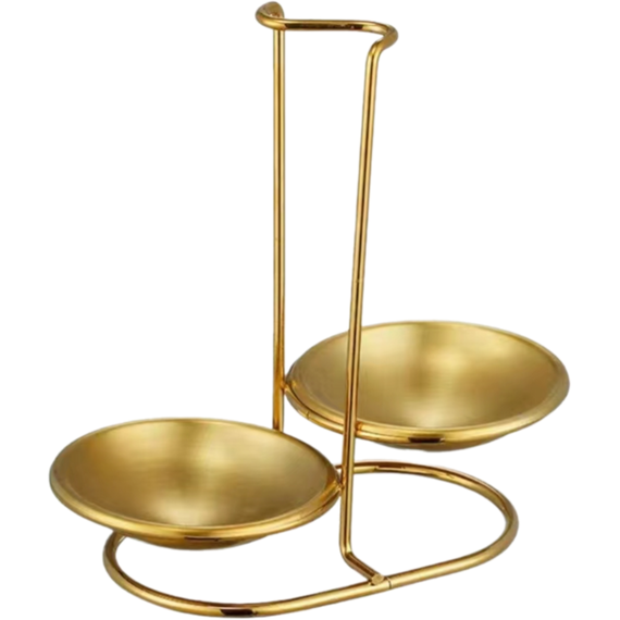 Подставка для половника и шумовки CRAZY PAN ЗОЛОТО используется для удержания кухонных приборов. Используется на предприятих общепита. Комплектация: подставка, две металлические тарелки. Изготовлена из пищевой нержавеющей стали. Высота 21см, ширина 21 см. Диаметр одной чаши 11см. Цвет - ЗОЛОТО.