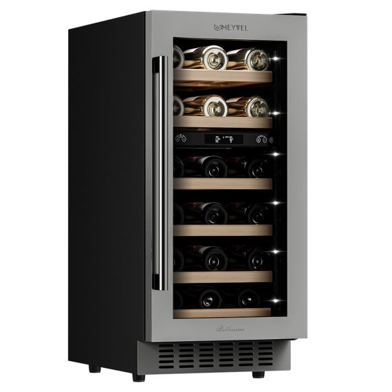 Компрессорный винный шкаф Meyvel MV28-KST2 обладает большой вместимостью и даёт возможность разместить до 28 бутылок стандартного типа Бордо (0,75 л). Располагаются они на выдвижных полках из дерева. Внутреннее пространство шкафа разделено на 2 температурные зоны, с возможностью настраивать каждую из них. Общий диапазон температуры у данной модели от +5°C до +20°C.