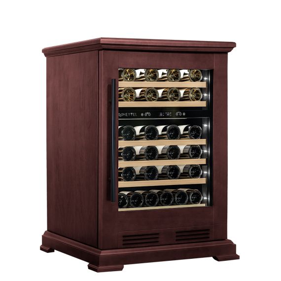 Компрессорный винный шкаф Meyvel MV46PRO-KBT2 (Спелая вишня) обладает большой вместимостью и даёт возможность разместить до 46 бутылок стандартного типа Бордо (0,75 л). Располагаются они на выкатных полках из дерева. Внутреннее пространство шкафа разделено на 2 температурные зоны, с возможностью настраивать каждую из них. Диапазон верхней зоны варьируется от +5°C до +12°C, а нижней - от +12°C до +20°C.