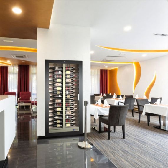 Двери винной витрины раздвижные (купе), что позволяет сэкономить пространство в помещении, а двойное закалённое стекло обеспечивает дополнительную звукоизоляцию и сохранение микроклимата внутри витрины.