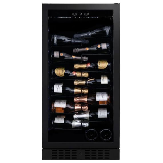 Лаконичный дизайн шкафа придаёт интерьеру современный вид. Чёрный корпус и рамка добавляют элегантности и солидности. В этой модели использовано панорамное освещение синего, янтарного и белого цвета, которое обеспечивает равномерную подсветку всех полок. (Освещение плавно включается при открывании дверцы, а через пару секунд после закрытия плавно гаснет.) Дополнительно у данной модели шкафа предусмотрен демонстрационный режим, во время которого освещение не гаснет. Такая функция помогает демонстрировать винную коллекцию Вашим друзьям и близким.