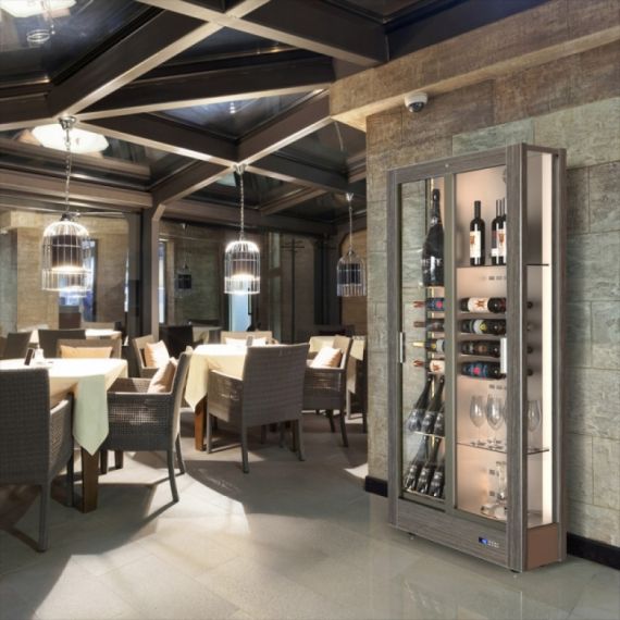 Двери винной витрины раздвижные (купе), что позволяет сэкономить пространство в помещении.