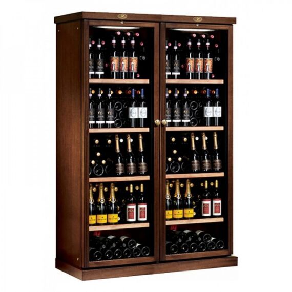 Модель оснащена статической системой охлаждения на базе компрессора SECOP (Danfoss), которая кроме охлаждения вина еще и сохраняет оптимальную влажность внутри камеры. Комплектуется шкаф девятью деревянными полками.