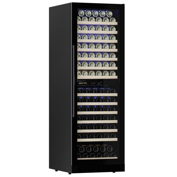 Компрессорный винный шкаф Meyvel MV163-KBT2 обладает большой вместимостью и способен разместить до 163 бутылок. Располагаются они на полках из массива бука. Внутреннее пространство шкафа разделено на 2 температурные зоны с возможностью настраивать каждую из них. Общий температурный диапазон этого шкафа от +5°C до +18°C. Холодильник поддерживает влажность в диапазоне 60-80%, как в настоящем винном погребе.
