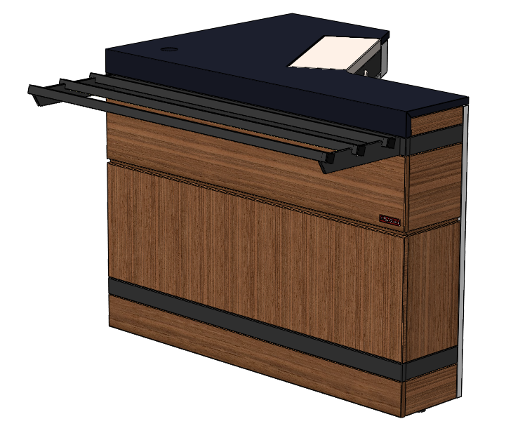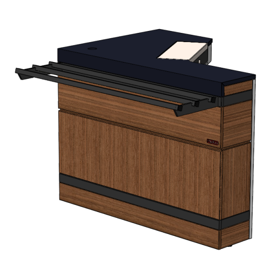 Прилавок кассовый левый линии раздачи «Filin» торговой марки Refettorio. Прилавок предназначен для установки на него кассового аппарата и расчета с клиентами. Прилавок имеет левое исполнение (направление потока слева на право). Для удобства подключения кассовых приборов в нише прилавка вмонтированы четыре розетки. На столешнице прилавка имеется отверстие с заглушкой под кабель-канал. Предусмотрена специальная полка для размещения системного блока персонального компьютера. Столешница: искусственный камень (кварцевый агломерат) - прочный износостойкий материал Подсветка: светодиодная подсветка фасадной части 3000 К Стандартная комплектация: прилавок, лицевой фасад из МДФ, направляющая для подносов из крашеной стали, встроенный съемный денежный ящик, запираемый на ключ. Дополнительные опции (не входят в комплект поставки): боковые фасады.