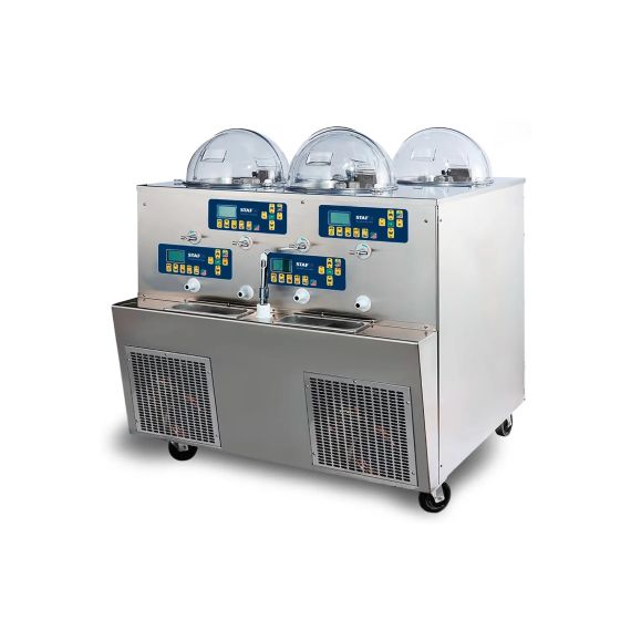 1055x1005x1176 мм, 220 В, 5 кВт, 330 кг. Фризер-витрина Gelato Live Show для приготовления, демонстрации и раздачи твердого мороженого / джелато (4 вкуса). Загрузка за цикл 4x(1,5-4 кг). Производительность 4x12 кг/час (15 л/час). Вертикальный цилиндр с верхней загрузкой, крышка с датчиком остановки вращения мешалки. Мешалка сталь AISI 304, регулируемая скорость вращения, с боковыми и нижними скребками. Электронный контроллер, 62 программы, инвертор. Две мойки, душирующее устройство. Функция размораживания цилиндра. Водяное охлаждение конденсатора. Корпус нержавеющая сталь.