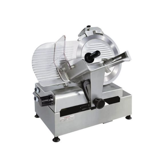 Габариты 685x540x545 мм. Диаметр ножа 300 мм, каретка 290 x 200 мм. Толщина нарезки регулируется, до 15 мм. Гравитационный слайсер для нарезки мяса, сыра, колбасных изделий и других продуктов питания. Толщина нарезки 0-15 мм. Слайсер для профессионального использования на предприятиях общественного питания. Нож из хромированной стали, корпус из лакированного алюминия с пластиковыми деталями. Основания - нерж. сталь. Электромеханическая панель управления. 1 скорость (40 слайсов в минуту), привод - шатунно-кривошипная система