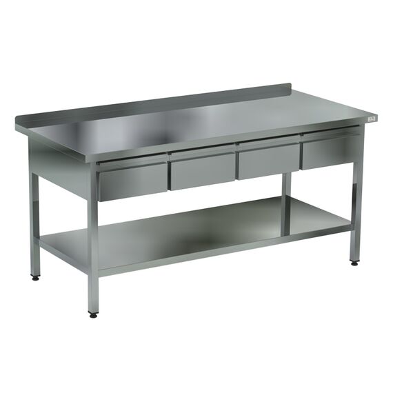 1600х700х870мм.,Стол с 4-мя выдвижными ящиками (столешница – нерж. сталь aisi 430, выдвижные ящики под столешницей, усиление ЛДСП, каркас нерж. труба 40х40, полка)