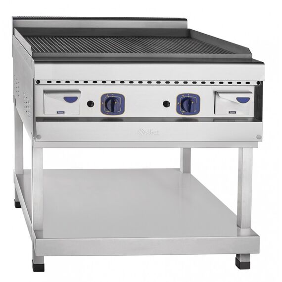 Газовый аппарат контактной обработки ГАКО-90/1П-С-02, рифленая стальная поверхность 834х703 мм, 900 серия, 840х900х950 мм, пьезорозжиг, газ-контроль, 16 кВт, на подставке с полкой, вся нерж.