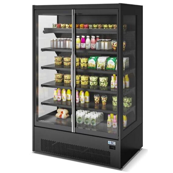 1300x908x2054 мм, 0.59 кВт, 220 В, 295 кг. -1/+4C. 5 полок без подсветки (4х450 мм, 1х400 мм). Двери стеклопакет распашные. Отделка RAL 7016. Подсветка LED 3000К. Встроенный хол. агрегат. R290.