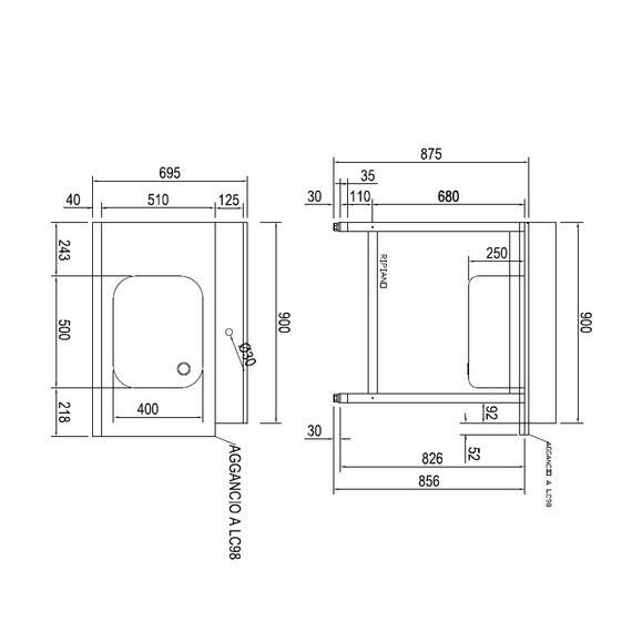 900х695х860мм., ванна 500х400х250мм., бортик, полка, левосторонний (SX/LEFT). спец. версия, рассчитанная на соединение с угловым модулем LC98