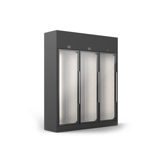 Код A1WW3HV5N+10*M220430006+5*M220430008, 2130х620х2550 мм, 1,3кВт, 220В, +4...+18С, 580кг, 1725л, до 630 бутылок (зависит от типа полок), с встр.агр. R290, корпус - черный. 15 полок R( по 5 в каждой секции). Стандартная подсветка включена в стоимость, теплый свет LED