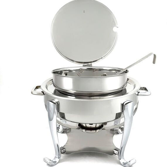 Нержавеющая сталь, размер - 46*38,5*27см, с CP (crome plated) ножками - из латуни с хромовым покрытием, половник в комплекте, емкость - d30*h14см, виды подогрева: жидкое топливо, индукция и термоэлемент EL-001