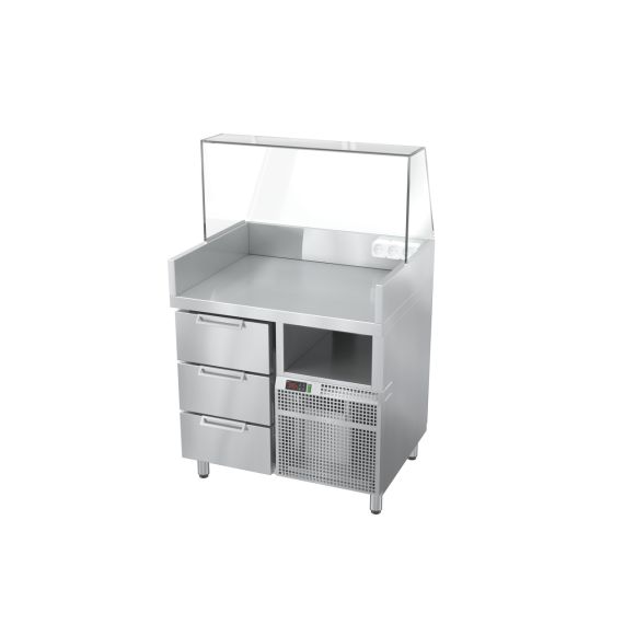 900х711х1425(845*)мм, Допустимая мощность подключаемыхизделий 7,5 кВт, Мощность холодильного агрегата 0,4 кВт, 220 В, Температура охл. объема +2...+6 C.* - высота по столешнице