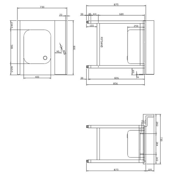 800х730х860мм., ванна 500х400х300мм., бортик, полка, левый.
