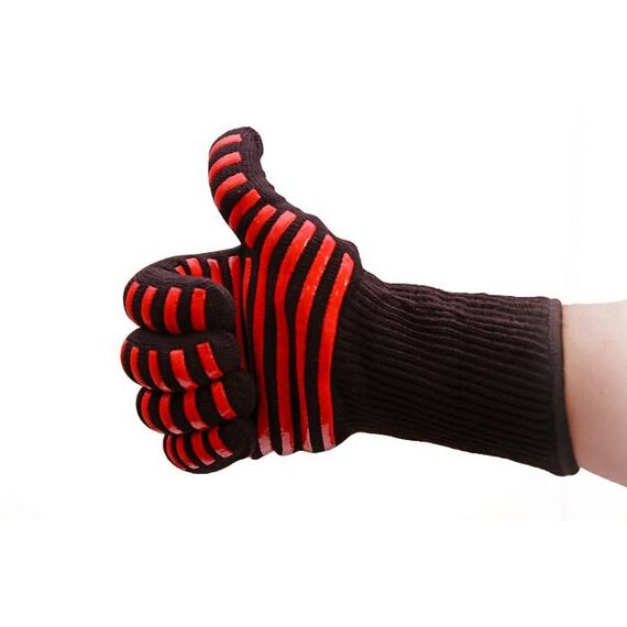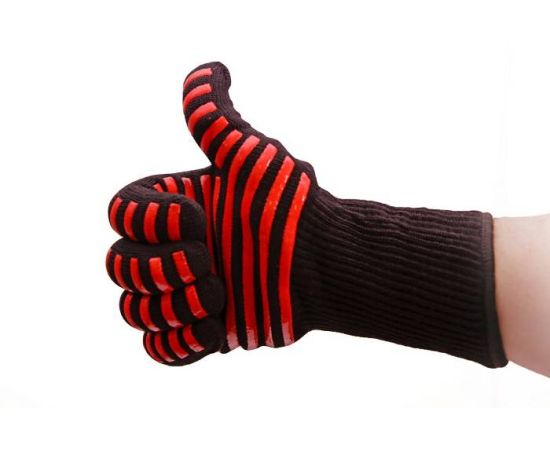 Перчатка-прихватка защитная BBQ, верх из чёрного жаропрочного арамидного волокна с красными силиконовыми кругами, внутри хлопок