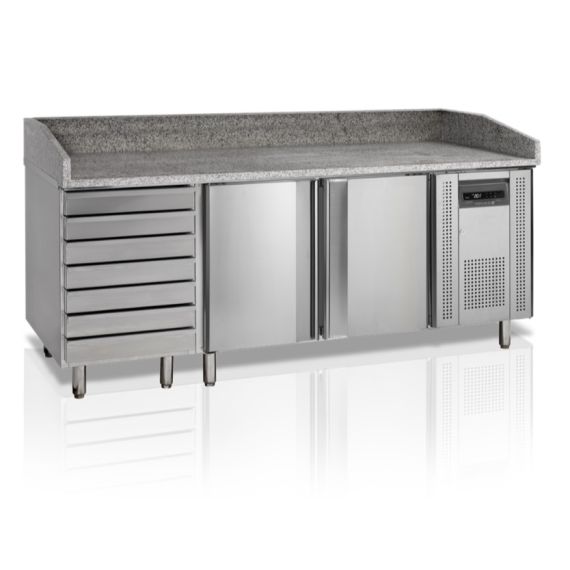 2045 x 800 x 1000мм, 0,3кВт, 220В, +2/+10С, брутто/нетто - 390/370л, 320 кг, с встр.агр. R600a, 2 двери +7 ящиков, нерж.сталь, направляющие под 7 противней для пиццы в каждом отсеке (400x600мм), гранитная столешница, вентилируемое охлаждение, автооттайка, регулируемые ножки.