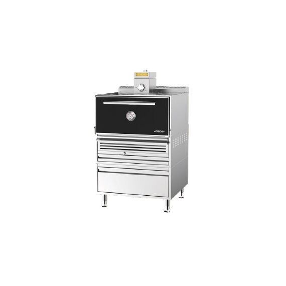 916х778х1660мм, в комплекте: искрогаситель, диффузор, щипцы, проволочная щетка, одна решетка для гриля 510*760мм и кочерга для золы, стол-подставка с ящиком, производительность - до 90 кг/час, рекомендуется для заведений с количеством посадочных мест до 120, цвет двери черный