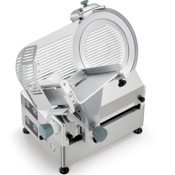 700x660x750 мм, 0,37+0,18 кВт, 220 В, лезвие 350 мм, толщина нарезки до 23 мм, производительность 29 ломт./мин., для замороженных продуктов до -12 градусов цельсия, с микропереключателем, версия CE. Сваренная округленная конструкция из нержавеющей стали и отсутствие острых краёв и видимых винтов. Хромированное основание, самосмазываемая втулка, 49,5 мм расстояние между лезвием и двигателем, стандартный инструмент удаления лезвия (BRT), наклон лезвия 35, охлаждаемая венилятором каретка движения мотора. Версия с зубчатым ножом в комплекте