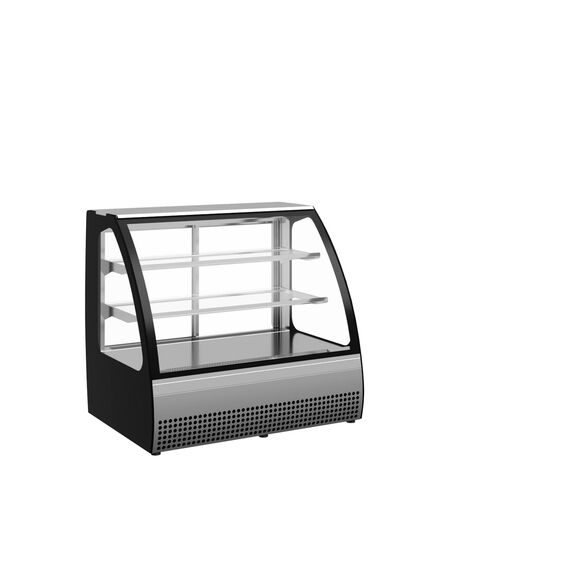 950х730х875 t режим + 1…+10 C. Витрина холодильная,со встроенным агрегатом, гнутое стекло, 2 стеклянные полки, полезный объем —0,18 м3,охлаждаемая площадь поддонов для выкладки продуктов, 0,95 м2, динамическое охлаждение, раздвижные задние шторки, оттайка ТЭН, потр. эл.энергии в сутки —3,1 кВт, цвет корпуса — черный, экспозиционные поверхности — отделка под серебро, 14,4Вт, 220В.