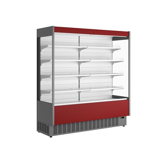 1906х670х2070, t режим +1…+10 C. Витрина холодильная,со встроенным агрегатом, гнутое стекло, 4 металлических полки, полезный объем выкладки— 1,03 м3,охлаждаемая площадь поддонов для выкладки продуктов 3,68 м2, динамическое охлаждение, оттайка ТЭН, потр. эл.энергии в сутки —20 кВт, R404A, цвет корпуса —белый, фриз и щиток — красный, 14,4Вт, 220В.