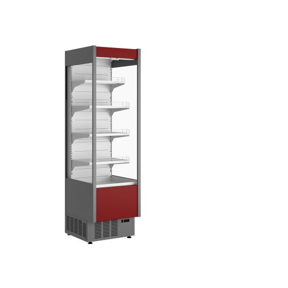 591х670х2070, t режим +1…+10 C. Витрина холодильная,со встроенным агрегатом, гнутое стекло, 4 металлических полки, полезный объемвыкладки— 0,29 м3,охлаждаемая площадь поддонов для выкладки продуктов 1,00 м2, динамическое охлаждение, оттайка ТЭН, потр. эл.энергии в сутки —9 кВт, R404A, цвет корпуса —белый, фриз и щиток — красный, 14,4Вт, 220В.