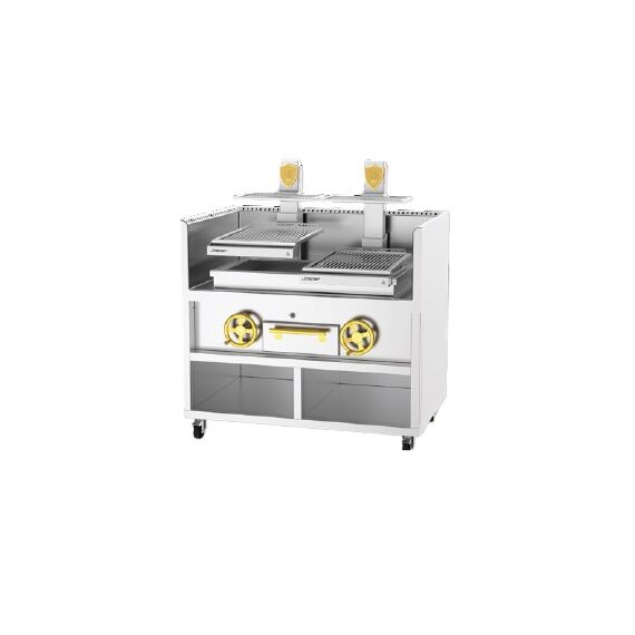 1400x900x1610мм, площадь гриль-решетки 500x600мм (х2шт), вертикальная стойка 290мм, гидравлическая система регулировки высоты, время розжига около 20мин при температуре гриля 250C, ежедневное потребление древесного угля в среднем от 20 до 22 кг, в комплекте: щипцы и кочерга