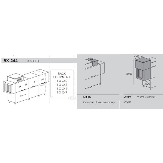 3200*805*1830/2120, (длина машины с учетом сушки) 380В, 43.1 кВт, 134-238 кас/ч, DDE - дозатор моющих и ополаск. средств, DR69 - сушка, HR10 - компакт. теплорекуператор - консоль: для подключения к холодной воде (потреб. энергии, t и влажн. воздуха в помещен. ниже, чем при доп. мощности), корзины в комплекте: С40 для тарелок, C44 для бокалов, С43 для GN1/1, C47 для приборов, DX - движение СПРАВА-НАЛЕВО, деление на 2 части,