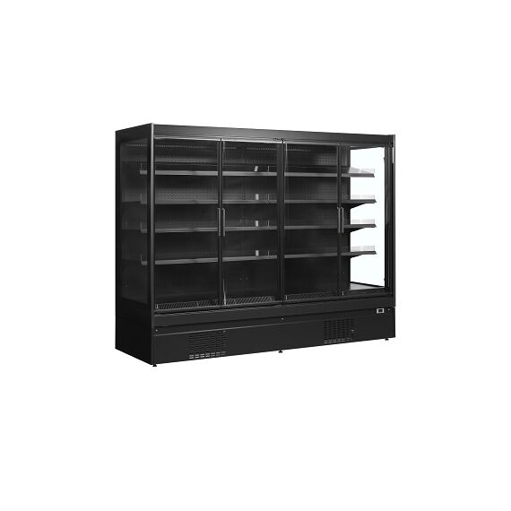 2600 x 920 x 2035 мм, 2.2кВт, 220В, +2/+6С, 1785 / 1540 л, с встр. агр., R290, вентилируемая, 4 открытых полки с регулируемым наклоном + основание, с ночной шторкой, с LED-подсветкой. Цвет - черный