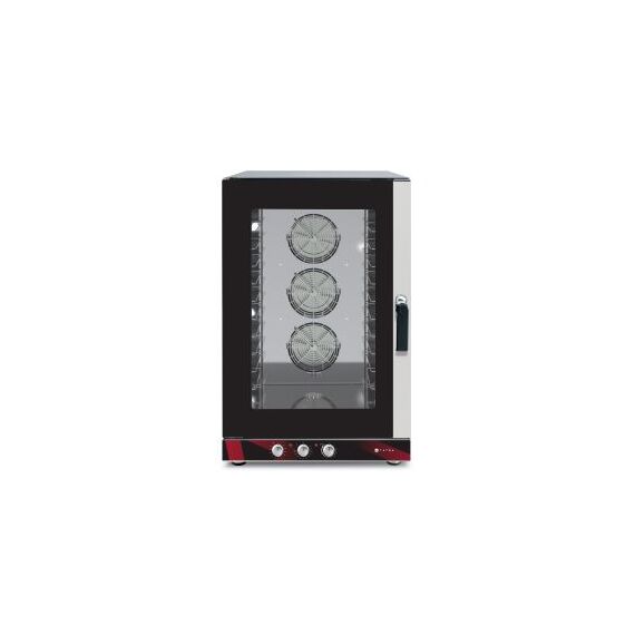 817х825х1317 мм, 400В, 15,8 кВт, 10 уровней GN1/1- 600х400, электромеханическая п/у, инжекторное пароувлажнение, макс. температура 260С, 3 вентилятора, реверс, 1 скорость вращения вентиляторов, таймер