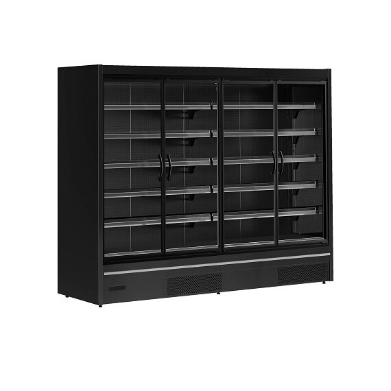 2580x805x2095 мм, 1,11 кВт, 220В, -1/+5С, объем 2098/1480 л, с встр. агр., R290, вентилируемая (динамический холод), 10 полок, размеры полок 1250x400 мм, 4 дверцы, с LED-подсветкой, цвет черный