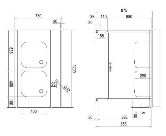 Спец. исполнение 1200х730х860мм., 2 ванны 400х400х250мм, бортик, левый.